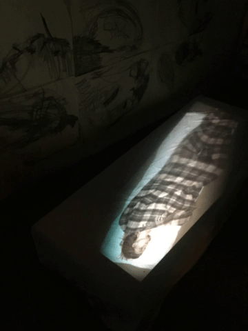This artwork in progress is assembled from 4 mediums that form one installation. The platforms that were used, paintings, text, video and audio give it perspectival depth and distance to form a relatable yet personal project.