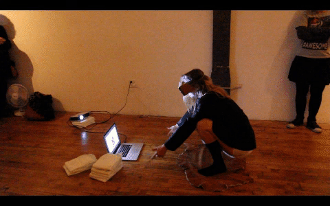 After setting everything up, Katrín positions herself close to the ground, mother earth’s skin, on an Iceland-shaped sheep hide in squatting position, arms forward and palms up. She indirectly looked at each and all the audience members, the audience that was physically there and the one that was not, via a VR device. She also looked at herself, present and past, directly and indirectly, through two audiovisual platforms. As a tribute to Nam June Paik’s Buddha (1974) she records and streams herself simultaneously as she performs. Motion is backed up with oration in a discourse that brings up her devotion to her cause repeating “Me many me, I am all yours”. Through the performance her speech gets impaired with non-feigned stammer driven by the energy she directs to the act of defecating on a diaper. As she gets closer to the conclusion of the performance she takes the diaper out to present it to the audience and then marks the Iceland-shaped sheep skin with the feces.