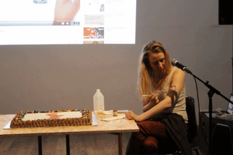 This performance took place in Mengi under the name of Heart Art. The setting, a mildly dark room with a table, a chair, some tools, projector and a screen creates a mirage of simplicity that rather than hiding a message, evokes humbleness as a statement of anti-materialism. This celebration of the 1st of May, and of all its philosophical and sociological connotations brings the audience to a battle, a tribute to the endless struggle where Katrín I Jónsdóttir Hjördísardóttir embodies the revolutionary soldier that, by nature, never stops fighting for peace and love. The artist utilizes the stick & poke technique to give herself a prison-style tattoo of a heart surrounding the words hjartans list on her left arm. The act of tattooing is performed while the projector shows pre-recorded footage of Katrín’s computer screen where she switches between different videos about philosophy, propaganda and ideology manifestos.